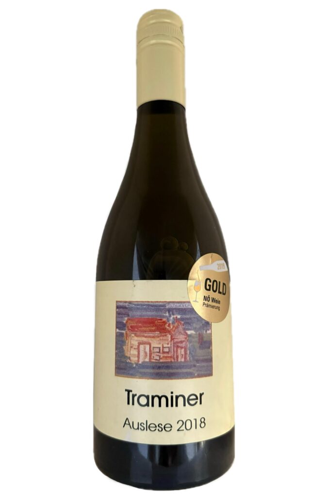 Traminer Traminer 2018Auslese lieblich € 8,00GOLD NÖ-WeinmesseEin wuchtig, eleganter Wein duftend nach Rosenblüten. Kräftiger Körper mit moderater Süße. Am Gaumen lang anhaltender Abgang.
